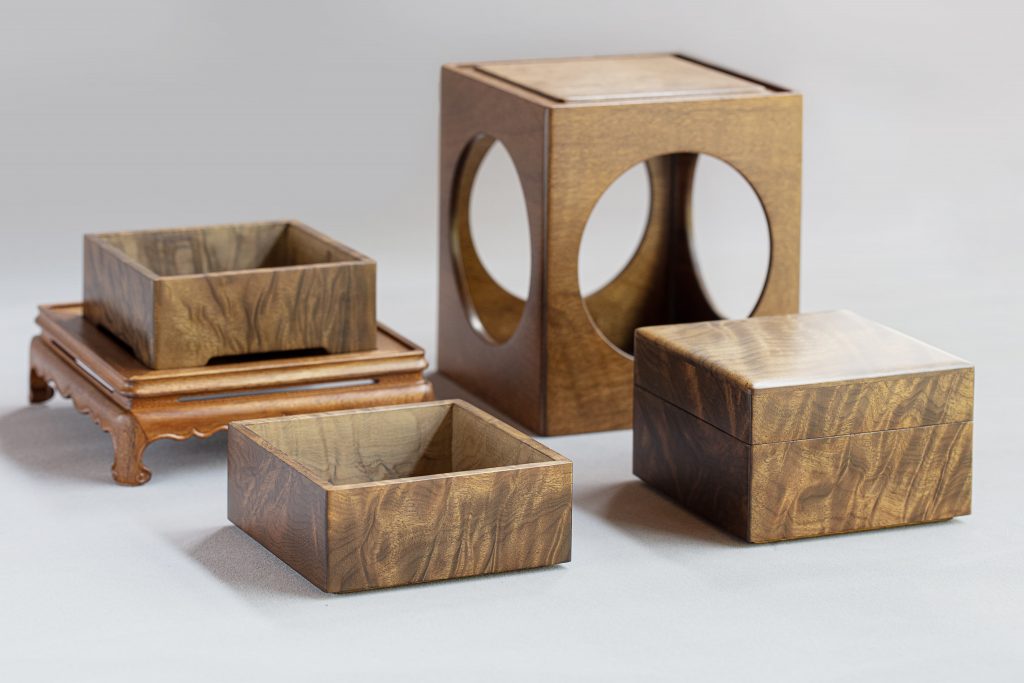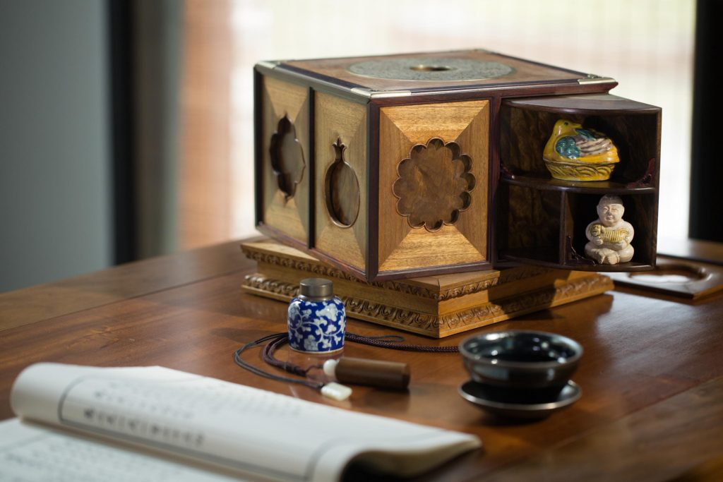 既可整体作为案头清供,又可拆解内盒单独使用。如意云纹底座和镂空盒罩的设计,在方寸之间体现了虚实相济、方中寓圆的传统美学思想。